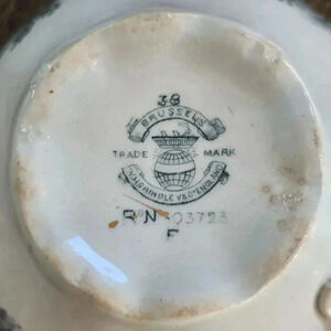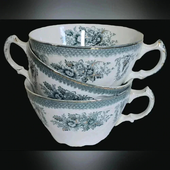 Set of 3 beautiful bone china teacups from the 1890s by W H. Grindley & Co. of England. The pattern name is Brussels, and features beautiful turquoise flowers and decorations with gold accents and trim. These are in amazing condition with only one tiny chip at the bottom of one teacup as seen in the photos. Add to your existing China or use for craft projects.