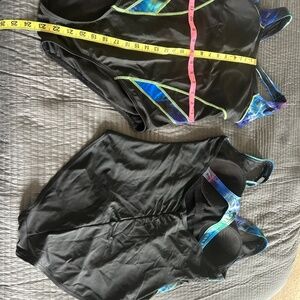 Two bathing suits black with color detail size large. One green bathing suit size L. Bathing suits Used but in like new condition. Board shorts size L used, good condition and flip flops size 8 used like new condition
