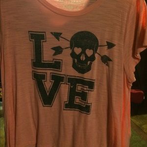I'm selling these 3 tops. 2 of them have Bethany's face/ body on it and they are crop tops! They're super cute! The 3rd one is a "love" top (longer in back) and it's a peach color. Perfect for skull lovers:) the price I listed includes all 3 tops!