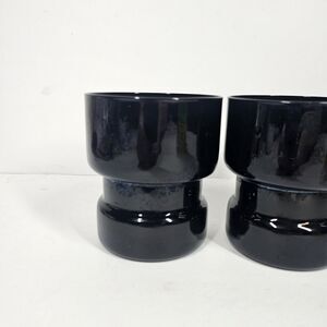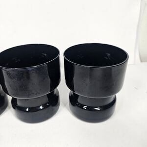 Set of 3 vintage black glasses. They are unsigned, and I do not know the maker or age. They are opaque black glass (no color shines through when you hold them up to the light). Such a great geometric shape, very retro. They are about 3 3/4" tall with a 3 1/4" diameter rim. Very nice shape with no chips or cracks.