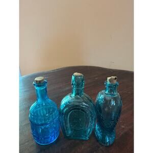 Charming set of three vintage blue miniature glass bottles. This delightful collection includes a Wheaton Horseshoe Bitters bottle, a Dr. Fisch's Bitters bottle, and a Root Bitters bottle. Perfect for collectors, these bottles add a touch of historical elegance and rustic charm to any display. Their miniature size makes them ideal for showcasing on shelves, desks, or curio cabinets.