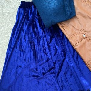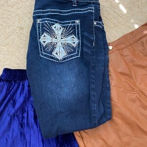 This is a two skirt, one Jean combo! The jeans are a size 16 bell bottom, while both skirts are a size large. The blue skirt is made of a pleated velvet and the brown is made of a pleather with a cotton lining. Each pair have been worn at least once but in very good condition, they will all be cared for and washed throughly after purchase.