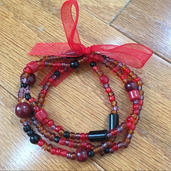 3 Bracelet set of red & black beaded bracelets. Stretchy to fit any wrist size. Comes with ribbon.