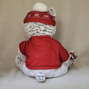 3 Build a Bear plush animals. A wintertime black and white bear. He is wearing a stocking hat, red heart shirt and white pants. He also has a couple pom poms. Minnie Mouse pink Build a Bear has a bow, pink dress and writing on her paws. The white bear has a pink dress with black lace on top. She is wearing bunny slippers. All are in great shape.