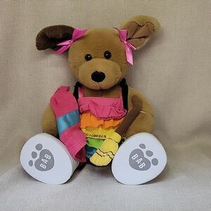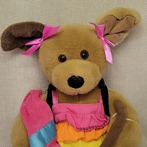 3 Build a Bear plush pets. There is a multi-color heart Kitty. She comes with mismatched shoes and a dress. Promised pets black puppy is wearing a black leather like outfit and the brown puppy has a dress, shoes, towel and small broom. All are in great shape.