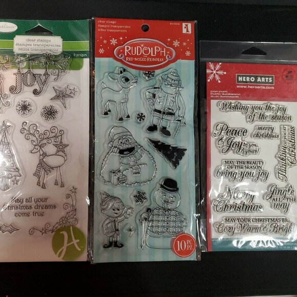 3 CHRISTMAS REINDEER JOY Clear Stamps GREETINGS Tree Holly Retired