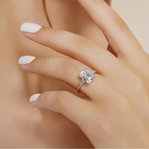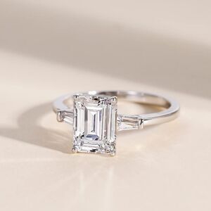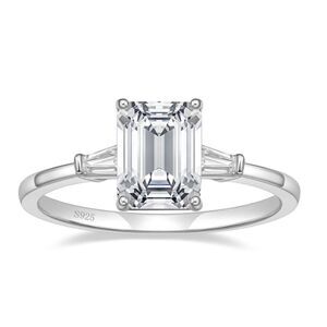 Stamped sterling 925, captivating two trapezoid-shaped stones brilliantly frame the center emerald stone in this classic three stone ring.