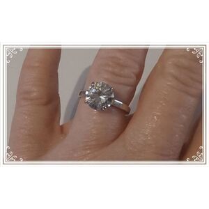 Now you can get that “thousands of dollars” look without breaking the bank. This beauty boasts the classic elegance of a solitaire gemstone. A 3 carat round cut high prong set AAA quality simulated diamond gemstone is extra faceted for extra brilliance and sits in a high polished 18K white gold plate band that is rhodium plated for a lifetime of shine and durability. It has a gallery underneath with small channel set pave stones. It is size 8.