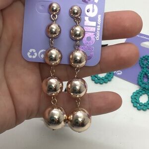 - (1) pair of metallic gold- toned retro ball beads dangle post back earrings. Approx 3” long.