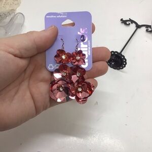 - (1) pair of metallic pink flower earrings with hook back. Approx 2.5” long.
