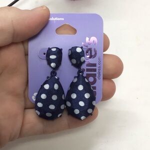 - (1) pair of navy blue Polkadot fabric covered dangle earrings with post back. Approx 2” long.