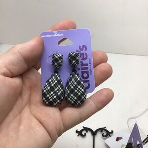 - (1) pair of black & white plaid, fabric covered drop earrings with post back. Approx 2” long.