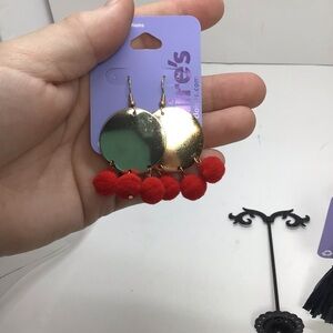 - (1) pair of gold circle, red Pom Pom dangle earrings with hook back. Approx 2” long.