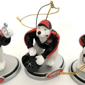 Celebrate the holidays with this Lot of 3 Coca-Cola NASCAR Polar Bear Pit Crew ornaments, each featuring the iconic Coca-Cola polar bears suited up in racing gear!