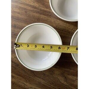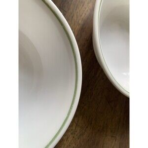This vintage Corelle bowl set includes 3 round cereal / soup / dessert bowls featuring a green stripe, with a diameter of 6.25 inches. Made in the United States in the 1970s, this set is a charming addition to any kitchen or dining room, adding a touch of Americana decor to your table setting. Please see all photos for condition. This green rim design was included in patterns Floral Spray, Spring Meadow, and Spring Blossom, and possibly others.
