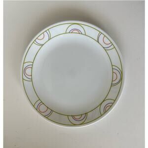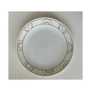 Cute white dinner plates with lime, purple, and salmon rings. Limited manufacturing from 2008-2010 only.