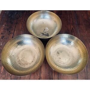 (3) Creative Co-Op Round Hammered Metal Bowl, Gold Finish, 14". These were used for display at a clothing boutique so they do show signs of wear, loss of paint, etc - see photos. One retails new for $40.