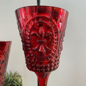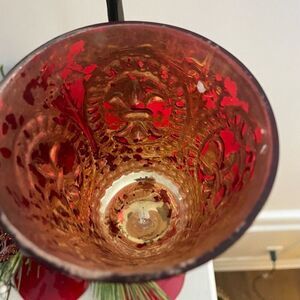Includes box, three creative co-op, red hobnail fleur de lis chalice style candleholders. I used tea lights, but votive would work as well. The glass is like mercury glass with that foil finish but a little more substantial than the mercury glass. You would find on a vintage Christmas ornament. Three sizes: eight, 10 and 12 inches tall. Comes with the box that has the Styrofoam insert cut out shapes to fit the candleholders for safe shipment. Perfect for the holidays or around.