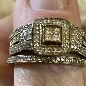 This stunning engagement wedding ring set from Boscovs Fine Jewelry features a beautiful cluster setting with a princess Simulated diamond as the main stone, surrounded by smaller diamonds. The ring is made of high-quality 925 sterling silver with a gold finish, and is designed with excellent cut grade and a grade for the diamonds.