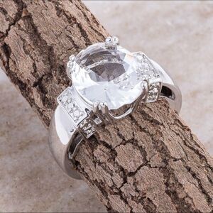 Three carats of oval and round cut lab created white Topaz gemstones are set in a heavy silver plate and rhodium finish. Beautiful and a great gift idea!