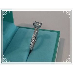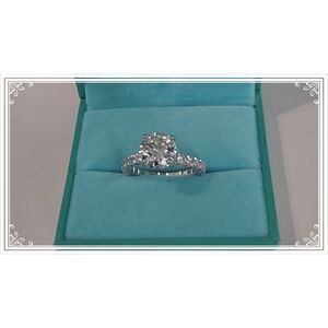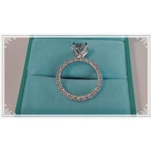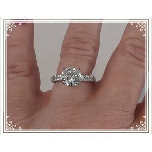 This stunning ring features a 1.5 carat crushed ice round cut genuine moissanite stone in a high prong setting. Round Cut simulated diamond gemstones are pave set on the top, bottom and all sides of the band for an additional 1.5 carats. Two sides have a pretty peek a boo cut out heart. It is size 8 with a 3 carat total gem weight.