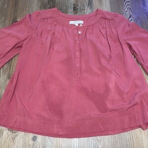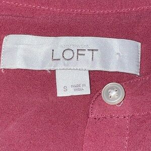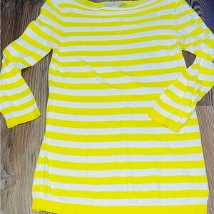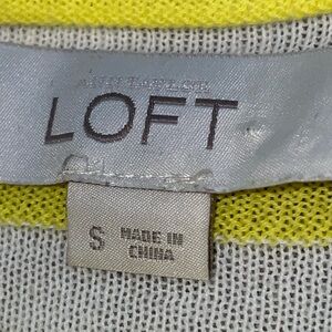 A lot of 3 Loft tops in like new condition. 1) Navy/white cotton blend boatneck sweater with bell sleeves 2) Mauve flutter sleeve rayon blouse 3) Yellow/white striped cotton boat neck knit top