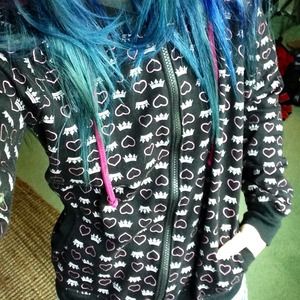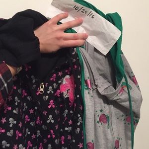 @cheriecurrie All three hoodies are in storage but the design for the middle hoodie is black with pink and silver Skulls, Broken Hearts and Stars.