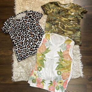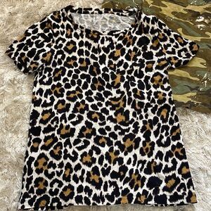 Third is a classic soft "vintage cotton" crewneck t-shirt with black and brown leopard designs all over. Size XS but its me like a small.