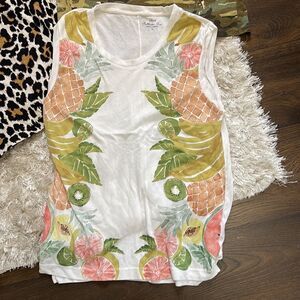 Second is a fun crewneck "Collector" sleeveless white top with pastel waterbrush-look fruit on the sides. Size XS but runs big, fits my like a small.