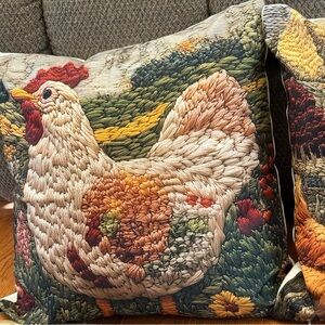 Decorative throw pillow featuring a farmhouse chicken tapestry design. Perfect for adding a rustic touch to your home decor. Great addition to your house during the fall season. Brand new never used them new inserts also. 18” X 18”.