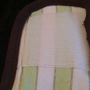 Too small for my dog. It has a pocket for the pad. Velcro closure. Elastic yo hold the pee pad in place. Never used but I took the tags before checking the size. It measures 13 1/2 inches long. Cute USA flag smiley face.