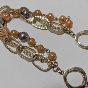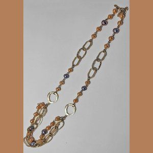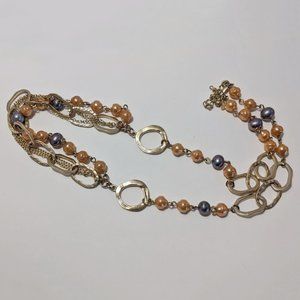 This is a Premier Designs necklace. It has peach and grey, faux pearls. It is one single chain that leads to 5 cascading chains of faux pearls 3 small chains and one large chain. It is adjustable and It measures 24" - 27". Great colors for spring. It shows minimal signs of wear.