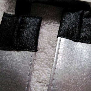 It looks like they could also be worn reversed, as a wide shiny silver, black, or brown pleather type look.