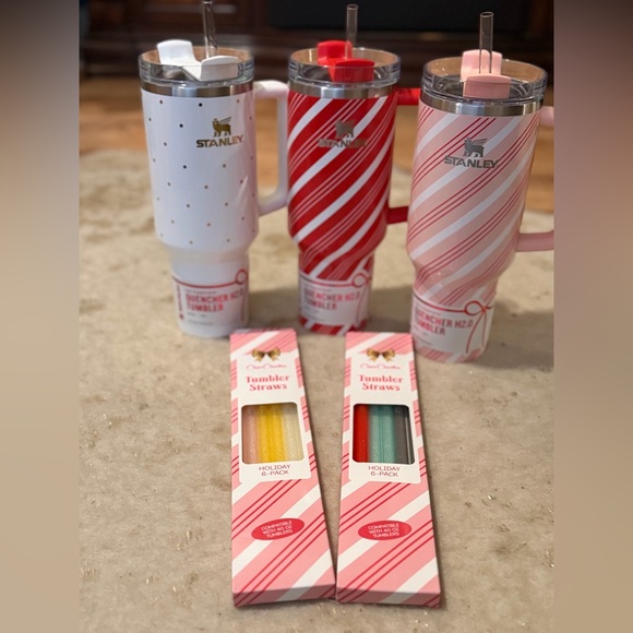 3 Stylish Stanley tumblers with red and white stripes, pink, white, red stripes and white with gold polka dots. Comes with two six pack holiday tumbler straws