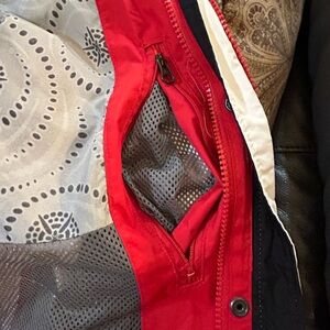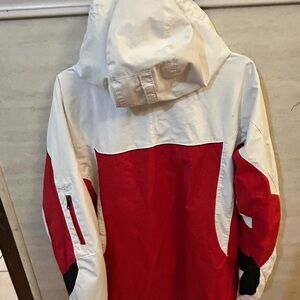 • Color Block Design: The jacket features a distinct red and white color-block pattern.