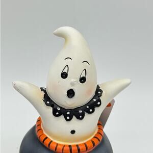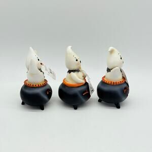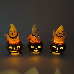 Complete set of all three Johanna Parker Transpac mini resin light up ghosts. Includes one smiling ghost, one surprised faced ghost with arms up and one surprised face ghost with arms down that are sitting inside cauldrons with a jack o lantern faces.