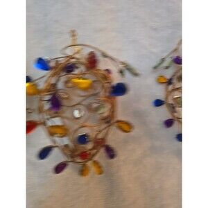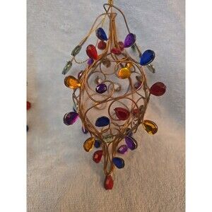 This product is a set of 3 large round Christmas ornaments made of plastic and adorned with multicolor metallic jewels. Each ornament is designed to hang from a tree and adds a decorative touch to any holiday decor. The jeweled design adds a touch of sparkle and glamour to the Christmas theme, making them a perfect addition to any ornament collection. Each ornament stands at 5.5-7 inches tall, making a substantial size that will surely be a focal point on the tree. Some jewels have fallen off.