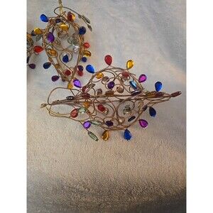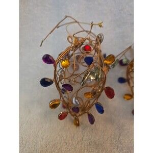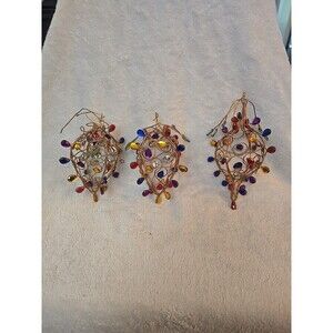3 Large Christmas Ornaments Goldtone Wire Plastic Jewels 5.5-7" Tall
