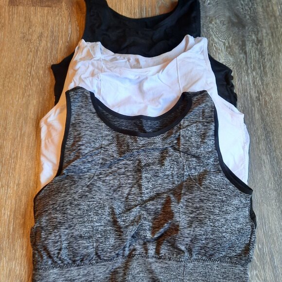 Price is for all 3 padded sports bras. White, grey, and black. All are a size large. These are from Amazon and the white bra is a little wider at the band. Nice wide bottom band. The back of the shoulders are sheer. Made by Eunicer. 90% nylon and 10% spandex. NWOT.