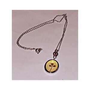 This was a gift I never wore. Inside is a 3 leaf clover or a shamrock. In the photos it looks yellow or amber, it is CLEAR. Comes with an 18" necklace. I am not sure of the metal, but it looks pretty substantial.
