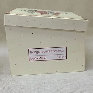 We have a set of 3 Living Quarters Santa Mugs. One mug is missing from the set. They measure 5"tall. All are in great shape..no chips or cracks. They come in the original box which is in excellent shape also. A great addition to your Christmas decor.