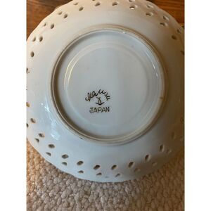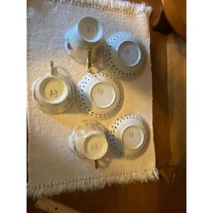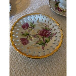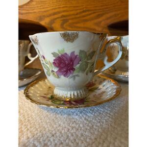 This is a beautiful set of 3 white opalescent cups with roses and gold floral design with reticulated saucers. These are in good used condition. Each cup is 3" tall.