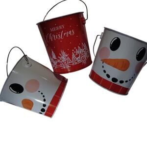 Festive trio of metal buckets featuring winter holiday designs. Includes two snowman-themed pails with cheerful faces and red trim, plus one red bucket with a white “MERRY Christmas” village scene. Each measures 4.5 inches high with a 4.375-inch top diameter and 2.75-inch bottom diameter. Ideal for seasonal décor, gift packaging, or party favors. Durable tin construction with metal handles.