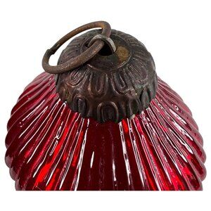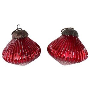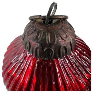 Enhance your holiday decor with this set of three vintage glass Christmas tree ornaments. Crafted with intricate ribbed designs and rich red and blue hues, these ornaments are fitted with elegant metal caps. Ideal for collectors and those looking to add a classic touch to their festive decorations.
