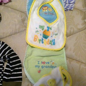The vast majority of clothes are by Carter. Blanket, several tops, dresses and one piece out fits. Includes warm pj's one of which is First Christmas themed. There are also several bibs and a burp towel. Clothes look like they have not been worn/used. One pull-over hoodie that is probably sized for a 6 month old.