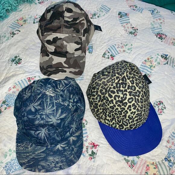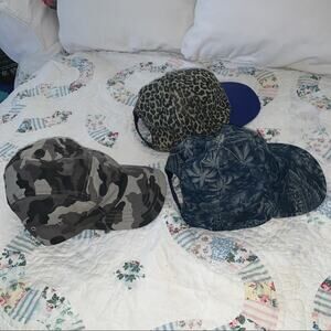 Trucker hats/baseball caps. All Brand new - 2 with tags and one nwot. One leopard, one CAMO, one Hawaiian print. By Forever 21 Men but these fit women too!