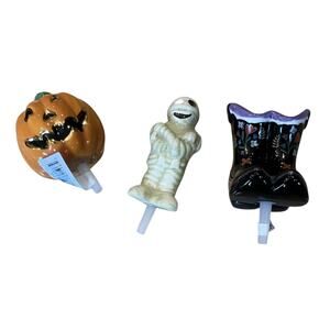 This is a set of 3 Nora Fleming Halloween minis for decorating platters and dishes. It includes Mummy Dearest A403; Pumpkin Jack-o-lantern Carved Cutie A216 & So Bootiful A401. The set includes three small ceramic decorations with a solid multicolor pattern in the shape of novelty items perfect for Halloween. These items are refrigerator safe and have a glossy finish, adding a contemporary style to your home decor. The brand, Nora Fleming, is known for its unique and whimsical designs, making these pieces a fun and festive addition to your kitchen or dining area during the Halloween season. The boots and pumpkin both are new with their tags, the mummy is like new with no flaws. A great set!