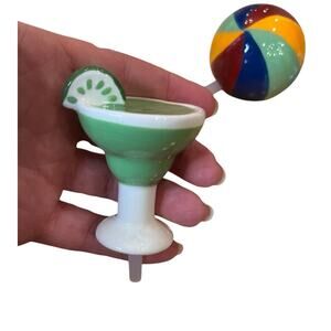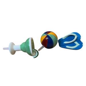 The Nora Fleming Minis set of three includes: Lime & Salt, Please (Margarita) A130; Have a Ball (Beachball) A14; & Sunning & Funning (Flip Flops) A156. These 3 small porcelain items feature a multicolor beach-themed design. Each piece is novelty shaped and all-over patterned, perfect for occasions like pool parties, Cinco de Mayo, and summer celebrations. With a contemporary style and fit for all Nora Fleming items, these miniatures are beautifully painted and made in China. They are all in excellent condition with no flaws! Ideal for adding a touch of beachy flair to your home decor or serveware collection.