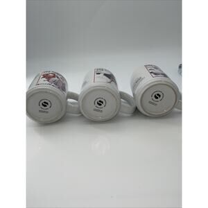 The product is a set of three Norman Rockwell Saturday Evening Post coffee mugs from 2002, featuring a Christmas theme. These mugs are made by Sherwood Brands of RI, Inc. and are crafted in a toleware style. Originating from China, these collectible mugs are a charming addition to any kitchen or home décor, showcasing a festive and nostalgic design that would be a delightful addition to any coffee lover's collection.