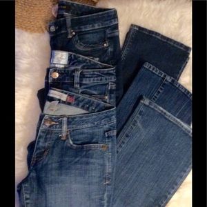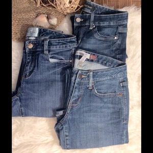 Fabulous deal, price is for all three pair! Measure approximately as follows: WHBM Pair #1: "love effortlessly" waist 27 1/2", rise 8", inseam 29" fabric 99 cotton 1 spandex; WHBM Pair #2 "feel beautiful" waist 30", rise 8", inseam 30", fabric 99 cotton 1 spandex; Aeropostale "hailey skinny flare", waist 29", rise 7 1/2", inseam 30 1/2", fabric 99 cotton 1 spandex, distressed bottom hem. All are in great shape, please see photos for details!